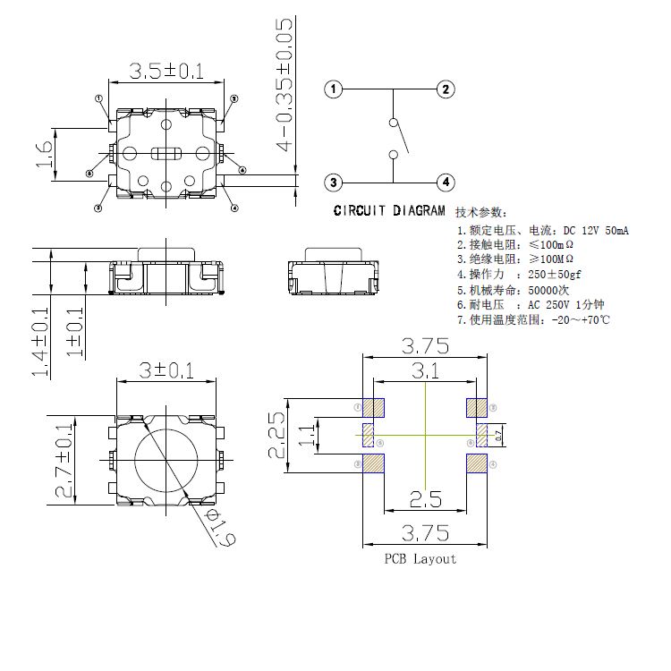 輕觸開關(guān)技術(shù)參數(shù): 1. 額定電流、電壓: DC 12V 50mA 2. 接觸電阻: ≤100mΩMAX 3. 絕緣電阻: ≥100MΩMIN 4. 介電強(qiáng)度: ≥250VAC/1min 5. 回流焊: 250°CMAX 6. 使用溫度: -25 ℃ to 70 ℃ 7. 使用濕度: ≤85% RH 8. 使用壽命: 50000次 應(yīng)用:數(shù)碼、安防、電腦、通訊產(chǎn)品、家用電器、智能家居、穿戴產(chǎn)品等。 |