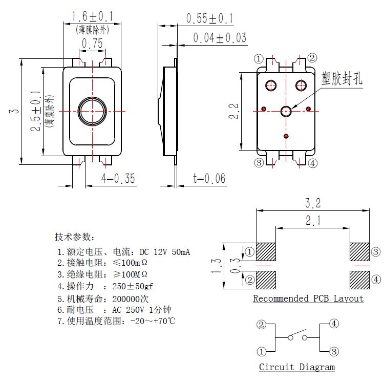 規(guī)格:2.6mm*1.6mm ? ? ? ? ? ? ? ? ?力度:250士50gf