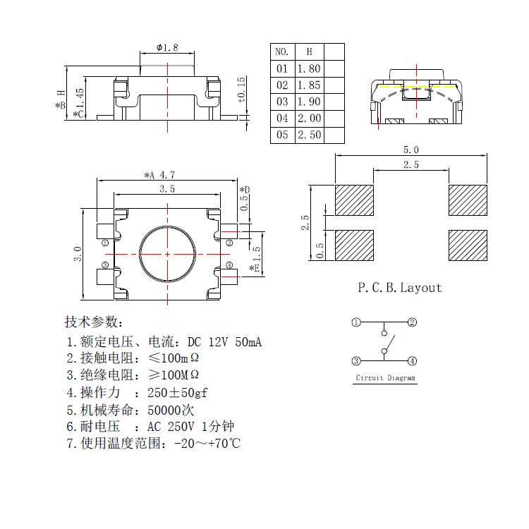 輕觸開關(guān)技術(shù)參數(shù): 1. 額定電流、電壓: DC 12V 50mA 2. 接觸電阻: ≤100mΩMAX 3. 絕緣電阻: ≥100MΩMIN 4. 介電強(qiáng)度: ≥250VAC/1min 5. 回流焊: 250°CMAX 6. 使用溫度: -25 ℃ to 70 ℃ 7. 使用濕度: ≤85% RH 8. 使用壽命: 50000次 應(yīng)用:數(shù)碼、安防、電腦、通訊產(chǎn)品、家用電器、智能家居、穿戴產(chǎn)品等。 |