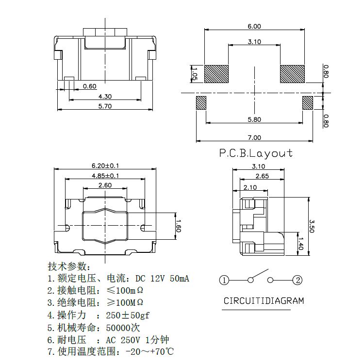 輕觸開關(guān)技術(shù)參數(shù): 1. 額定電流、電壓: DC 12V 50mA 2. 接觸電阻: ≤100mΩMAX 3. 絕緣電阻: ≥100MΩMIN 4. 介電強度: ≥250VAC/1min 5. 回流焊: 250°CMAX 6. 使用溫度: -25 ℃ to 70 ℃ 7. 使用濕度: ≤85% RH 8. 使用壽命: 50000次 應(yīng)用:數(shù)碼、安防、電腦、通訊產(chǎn)品、家用電器、智能家居、穿戴產(chǎn)品等。 |