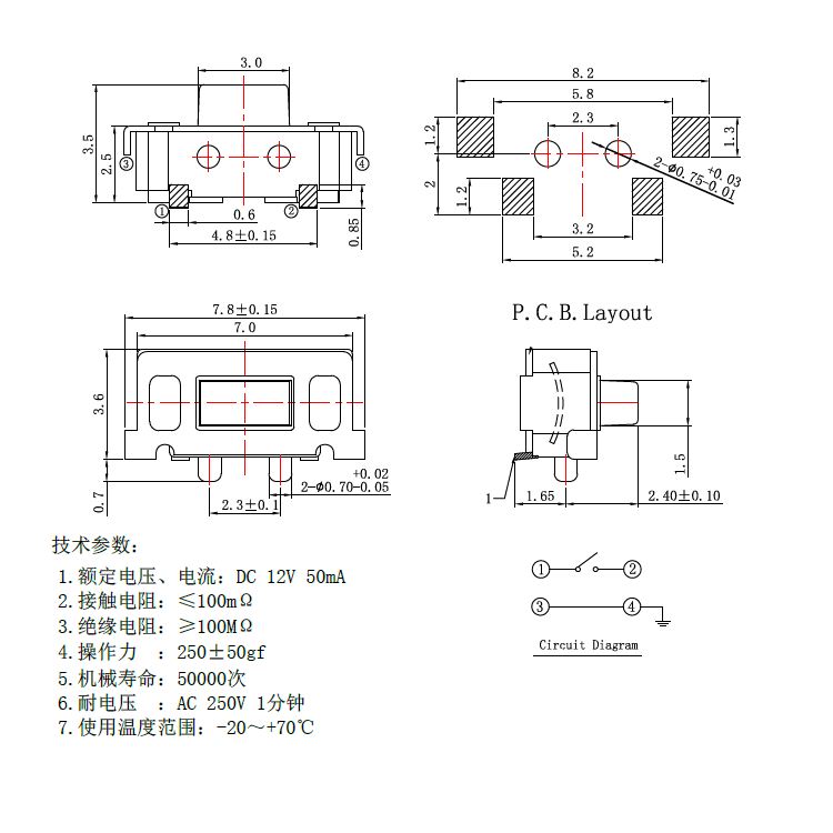 1. 額定電流、電壓: DC 12V 50mA  2. 接觸電阻: ≤100mΩMAX