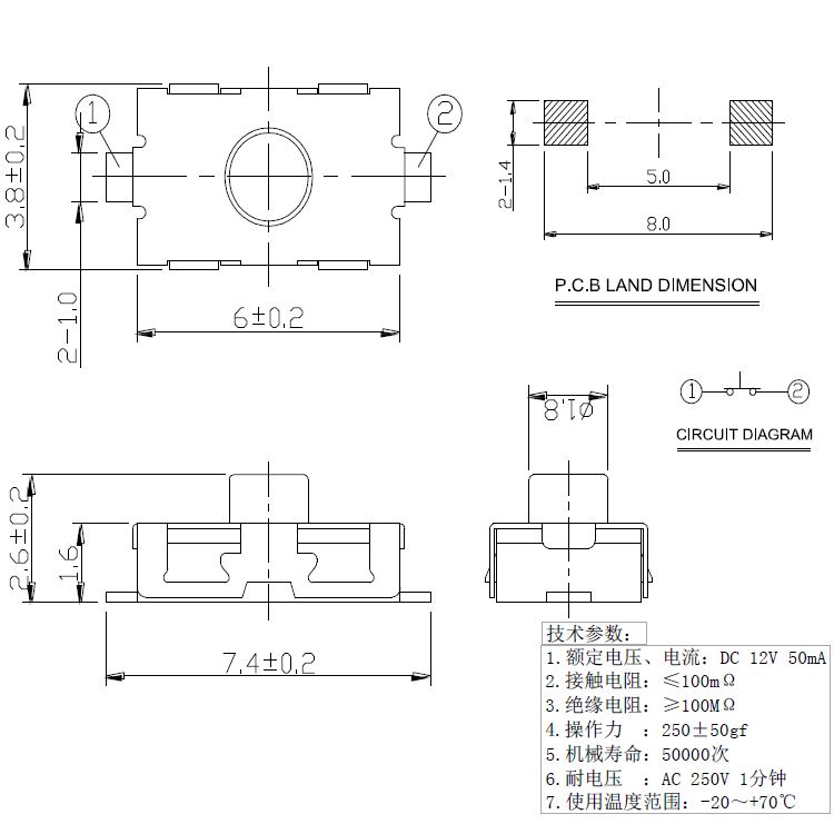 規格:3.8mm*6mm ? ? ? ? ? ? ? ? ?力度:250士50gf