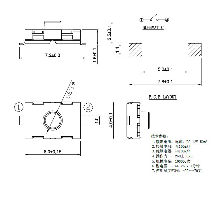 輕觸開(kāi)關(guān)技術(shù)參數(shù): 1. 額定電流、電壓: DC 12V 50mA 2. 接觸電阻: ≤100mΩMAX 3. 絕緣電阻: ≥100MΩMIN 4. 介電強(qiáng)度: ≥250VAC/1min 5. 回流焊: 250°CMAX 6. 使用溫度: -25 ℃ to 70 ℃ 7. 使用濕度: ≤85% RH 8. 使用壽命: 100000次 應(yīng)用:數(shù)碼、安防、電腦、通訊產(chǎn)品、家用電器、智能家居、穿戴產(chǎn)品等。 |