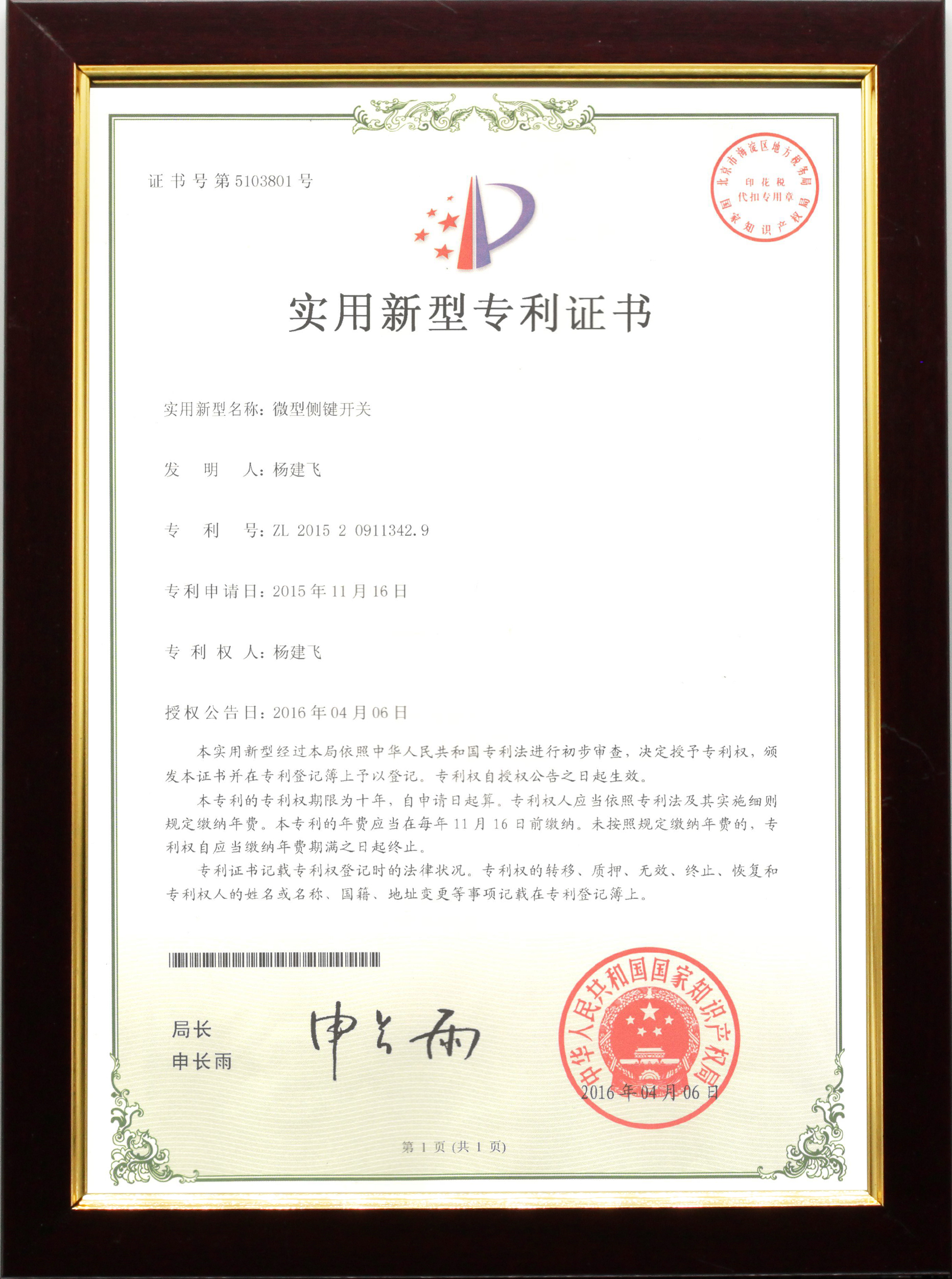 新型實用專利證書ZL201520911342.9