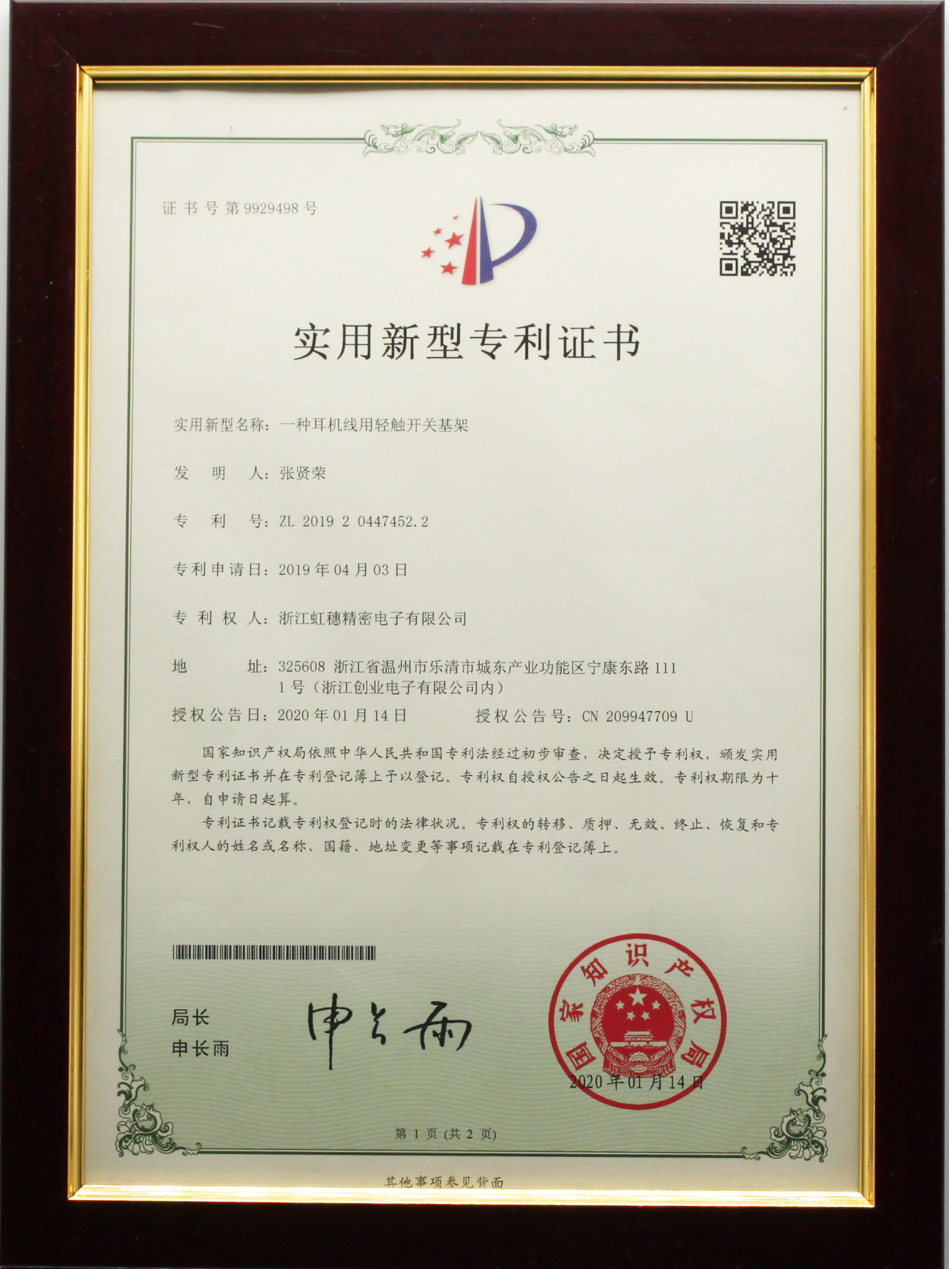 發(fā)明專利證書ZL201910267749.5