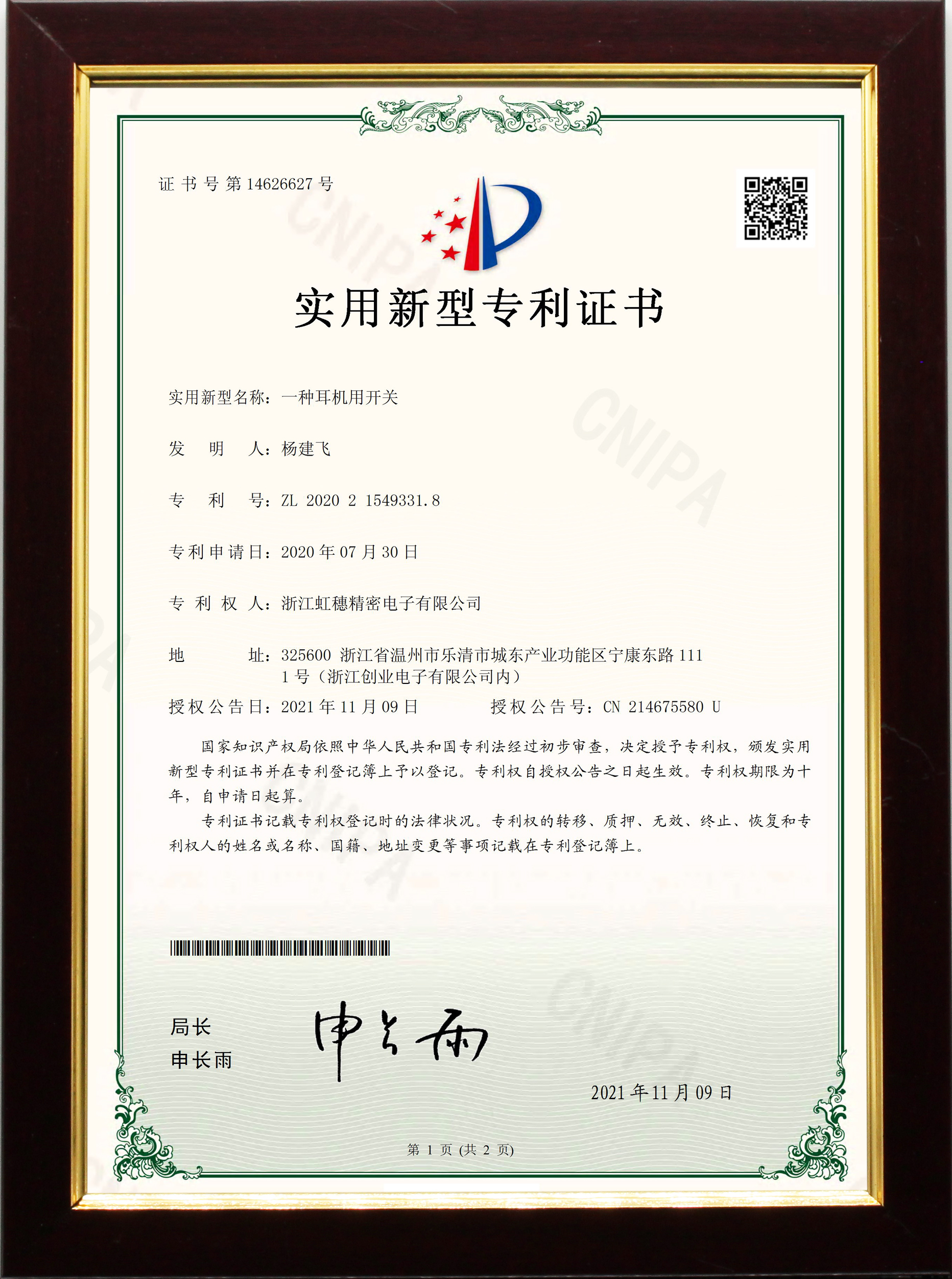 實用新型專利證書ZL202021551896